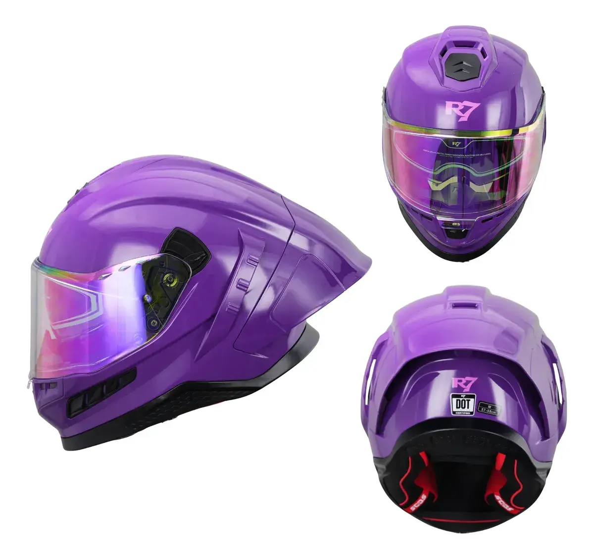 Características principales Estilo: Deportivo integral con perfil estilizado. Visor Interno: Gafas solares retráctiles de fácil accionamiento. Color y Acabado: Lila sólido con acabado de alta calidad. Color de Mica: Mica principal transparente de policarbonato. Especificaciones técnicas Seguridad: Certificación DOT internacional para máxima protección. Material: Calota de ABS de alta resistencia ante impactos. Ventilación: Sistema dinámico con entradas frontales y salidas de aire traseras. Interior: Almohadillas hipoalergénicas, cómodas, removibles y lavables. Cierre: Hebilla micrométrica de seguridad para un ajuste rápido y firme.