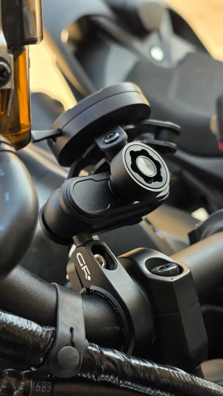 Sistema seguro de doble cierre: El bloqueo rápido magnético sujeta tu teléfono al instante; Gira para activar el bloqueo mecánico y doble seguridad, ideal para terrenos accidentados donde ver aplicaciones mientras conduces. Desconéctate igual de fácil para no perder una oportunidad de foto o una llamada importante